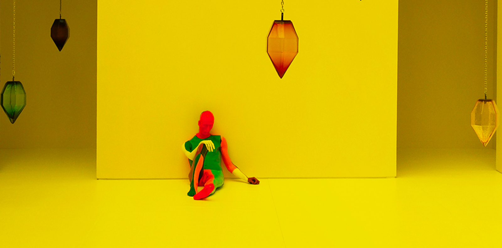 C’est que toute une population doit habiter ces trois espaces, que leur intense colorimétrie semble séparer du monde réel : les acteurs des films de Lakhrissi, (dont la voix fait office de bande son à toute l’exposition) et le personnage multicolore de Rondinone, nouvelle itération des Nudes en cire (série commencée en 2010 sur le mode monochrome anthracite et qui ne connaissait jusqu’alors que deux exemplaires multicolores), les intervenant·e·s qui ponctueront la durée de l’exposition, et les spectateurs, dont les corps et les identités devront trouver leur place symbolique parmi ces personnages fictifs.