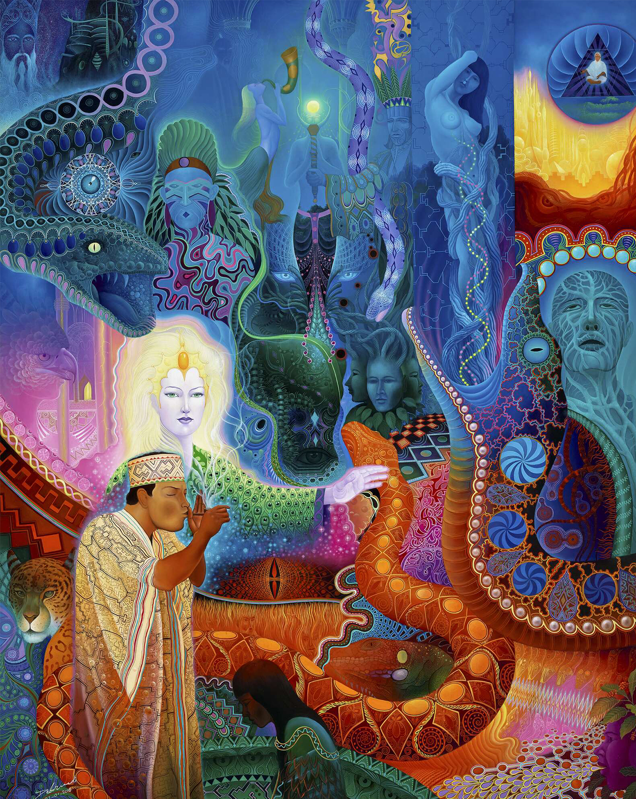 In 1990, when asked by a journalist whether he would be able to create without using any substances, the writer William S. Burroughs spontaneously delivered an eloquent answer: “I don’t think so”. The American novelist’s work has greatly been nourished by experiments with alcohol, heroin, morphine and opium, to the point where these substances have become an integral part of his lifestyle and creative process. Among his various experiences, one moment marked a major turning point in his life – the first time he tried ayahuasca during his trip to South America. This beverage, made from vines of the indigenous Banisteriopsis plant, has the ability to induce a trance-like, mystical experience to its users. The latter experience hallucinatory visions and presences, while their sensory perception is transformed and increased tenfold. According to popular belief, this experience purifies the body. For centuries, this unique state of consciousness inviting dreams into reality has been at the heart of the collective and traditional rituals of the Shipibo-Conibo, an indigenous people of the Peruvian Amazon, who use this preparation for ceremonial, spiritual, and therapeutic purposes. Their experiences with ayahuasca have given rise to a fascinating and enigmatic body of artistic work. The exhibition “Shamanic Visions” offers a fascinating insight into the topic until May 24th, 2024, at Musée du Quai Branly – Jacques Chirac. It also helps bring about a better understanding of these unprecedented forms of spiritual elevation, which have gradually won over Western artists and writers in the age of globalization, and keeps being a source of inspiration today.