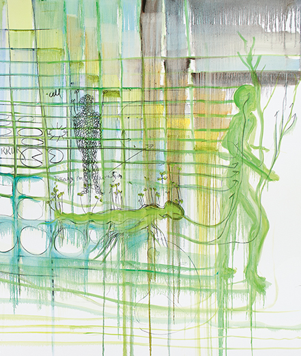 The green person you can see on the right-hand side of the painting is “L’Homme de Bessines” [“Bessines Man], who first appeared in my work in 1991. At the time, I was 30 years old and I painted him to look like me, imagining what I would look like at 60. He’s now become my main character. He’s changed over time, taking on different appearances, like the one I gave him in the sculptures I made a few months ago for the Palais Royal fountain, for his 30th birthday. In this painting, he represents humans who come and impose their own structure on the world by breaking it up, thinking they can control it using digital technology, which is represented by the lines crisscrossing the far-right-hand side of the painting. But even in the middle of this cold and methodical setup, organic life manages to break through, because the character’s body ends up fusing with plant life. For this, I was inspired by floor tiles and home bathrooms, where, because of the humidity, you always end up getting mold.