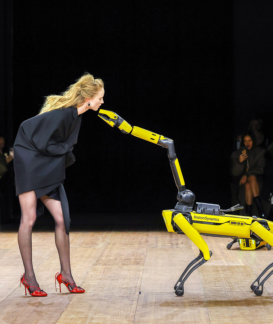 After making its mark in 2022 with Bella Hadid, the label Coperni made its comeback with robots that interact with the models for its Fall/Winter 2023-2024 show. Inspired by Jean de La Fontaine’s poem The Wolf and the Lamb, the show offers a parable about human fears in the face of the rise of machines. Playing the role of wolves, the dog-like robots put on a choreographed performance, demonstrating their ability to cohabit with men rather than simply gobbling them up alive.