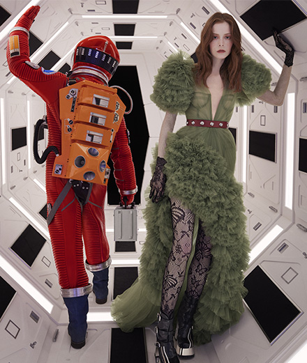 In the superb metaphysical science fiction film 2001: A Space Odyssey, one of Stanley Kubrick’s masterpieces, astronauts embark on a journey to Jupiter in the spacecraft Discovery One, following a signal from a monolith that was discovered on the Moon. In the final part of the film, we follow the adventures of astronaut David Bowman “beyond the infinite”. Gucci’s creative director Alessandro Michele replays this iconic scene by placing a female figure in a green tulle evening gown in the cold, futuristic white setting of the cult film. The journey beyond the infinite then becomes a journey to the end of the night. Alessandro Michele discussed this poetic encounter in a press release: “And the dreamiest evening dress dangled in soft tulle ruches bursts into the aseptic and dystopian space of 2001: A Space Odyssey. This situationist game mixes historical plans, references, experiences. The past explodes into the present. Everything can become anything, or something else. As in that famous scene of Kubrick’s masterpiece, where the bone turns into a spaceship. As in life.”