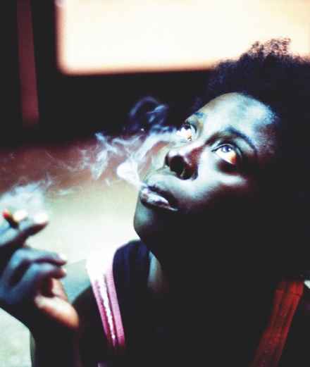 At night, Sapphire often wanders the streets of New York, especially the intersection of 125th and Lexington, a meth-dealing hotspot where ghostly silhouettes get high on K2, a synthetic drug 100 times more powerful than marijuana. The photograph’s framing doesn’t really allow us to say where this girl, whose age is impossible to guess, has stopped in the black of the night – the photographer later explains she was daydreaming just a few metres from a detox centre. In between her fingers smoulders a joint – Sapphire is an indefatigable smoker whom Khalik Allah has often photographed, to the point where today she trusts him entirely and lets him come close. In this portrait from 2013, her blood-shot eyes fix the sky, while a curl of smoke escapes from her fleshy lips. Her pose recalls James Baldwin’s when he was photographed in his home in Saint-Paul-de-Vence 30 years earlier. Underneath her Nina Simone-on-crack appearance, Sapphire seems to be savouring a brief moment of quiet in the chaos of this moribund neighbourhood. Who knows what she might be thinking about at this precise moment…