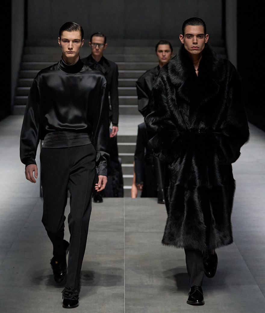 For its Fall-Winter 2024-2025 men’s fashion show, Dolce & Gabbana envisions a refined and elegant wardrobe dominated by black colors, reminiscent of the golden era of Italian couture.”
