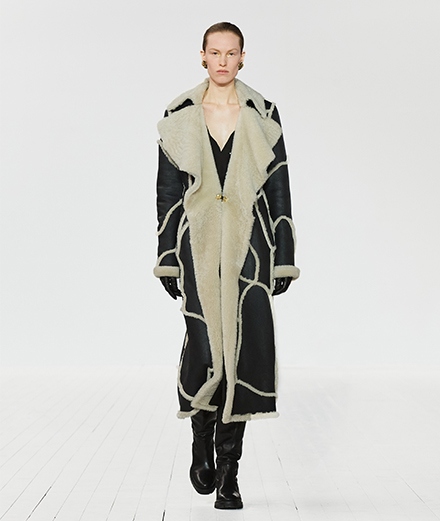 Inspired by the work and the life of the 17th century baroque painter Artemisia Gentileschi, Gabriela Hearst designed a fall-winter 2023 collection for Chloé filled with strong historical meanings. Because women’s bodies and choices were strongly regulated during the 17th century, Artemisia Gentileschi could be seen as one of the first feminist painters as she used her art and voice to advocate for women featuring women as key characters, often depicted in a higher position to men. The collection shows Renaissance-inspired silhouettes, innovative fabrications and unexpected materials that aim to reflect feminine power. A puffer cape coat with ruching along the seams made from recycled nylon, an off-the-shoulder dress cut above the knee with bishop sleeves from Nappa leather and lower-impact wool gauze—a Chloé pillar fabric— is used in a range of garments including capes and long dresses.