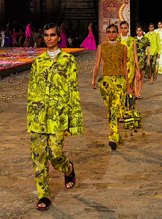 Drawing her inspiration from the Dior archival creations designed by Marc Bohan following his trip to Mumbai and Delhi in April 1962, Maria Grazia Chiuri has chosen a range of colors and fabrics that exalts the common influences she shares with Karishma Swali. In addition to timeless silhouettes that have now become ideal blank canvases on which the embroidery work stand out, a sequence of the show has been dedicated to silks – green, yellow, pink, and purple ones. As a tribute to Marc Bohan, those silks take shape in a collection of sophisticated evening coats, straight skirts inspired by saris and traditional Indian cuts, trousers, small boleros, jackets, and bras. A true sartorial genealogy defined by the various fashion heritages and cultures.