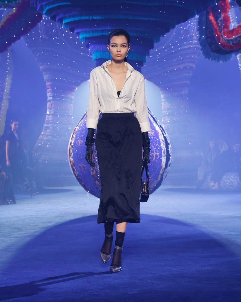 Waists are fitted, skirts are straight and corolla dresses are long, while gloves, hats, and stilettos make a comeback in the wardrobe… Both feminine and conservative, the ensembles recall the fashion of the 1950s at a time when women were encouraged to go back home rather than to join the workforce as it had been the case during the war when men went to the front. True to her feminist approach, Maria Grazia Chiuri still finds a way to incorporate some casualness, sensuality, and even androgyny, to open new meanings to this eminently Parisian style. Half-open blouses, discreet sexy bras, loose T-shirts, less restrictive cuts, and biker boots are worn with ensembles made of precious poplins woven with metallic thread, while dresses adorned with abstract floral patterns and luminous embroidery are combined with strapped pumps and comma-shaped ‘virgule’ heels originally designed by Roger Vivier for Dior.