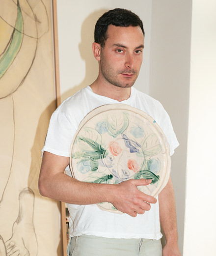 Watching Matthew Lutz-Kinoy at work on one of his large paintings, which (sometimes) include mythological characters, you get the impression of a gushing well of creativity. He works quickly, and knows exactly what he’s doing and where he’s going. But Lutz-Kinoy, with his panoramic curiosity, refuses to confine himself to just one medium and is constantly exploring new horizons. Costumes, disguises and fashion (he collaborates with the stylists at Eckhaus Latta) form part of the various performances he puts on, which are often realized in partnership with other artists. In March, at New York’s New Museum, it was with the music producer Sophie (aka Samuel Long, with whom he founded a group) that Lutz-Kinoy staged a reading about the influence of contemporary pop music, while in April at MoMA/PS1 he’s teaming up with artist Tobias Madison to stage a play by cult queer Japanese dramatist Shuji Terayama. And this summer, in Naples, he’ll be displaying his ceramic masks at the incredible Palazzo Donn’Anna, a place of mysterious legends that looks out across to Mount Vesuvius. But it was in Los Angeles, at his new studio, that Numéro met up with the eclectic young artist.