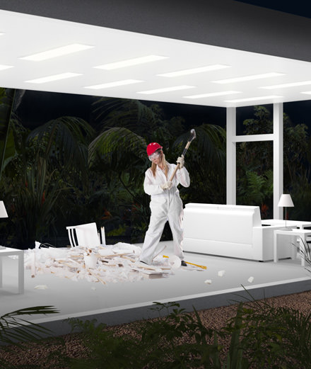 The Garden is an interactive installation in which each visitor can perform an act of destruction, within a glass room, on immaculate white furniture stereotypical of the futuristic modern designs of “the civilised man”. The glass box is surrounded by an artificial jungle, located in the heart of an enormous warehouse plunged into darkness. Created by the artist Doug Aitken, this installation is part of a “land art” triptych that features two other big scale installations, one at the Coachella festival and the other at the Art BaselContemporary Art Fair.