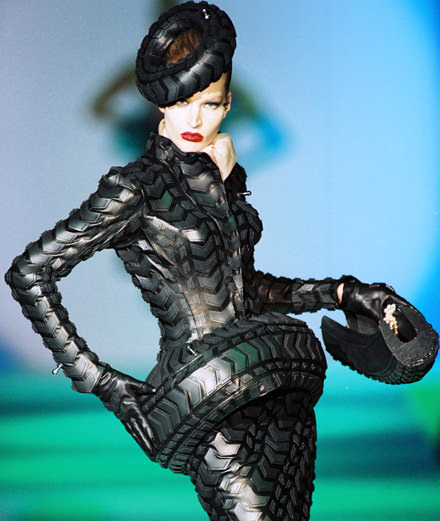 If the style and the madness of Mugler were to be illustrated by a single collection, Les Insectes would undoubtedly be the most appropriate. The designer surpassed himself by imagining a world where women were fused with insects, adopting their characteristics on a human scale: carapace, antennae, blacked out glasses like a fly’s eyes and the gracious wings of a butterfly in scintillating colours. Another remarkable piece was the “tyre” suit made of rubber and leather thanks to the designer Abel Villareal – an umpteenth blending of women and cars. With this daring collection, Thierry Mugler continued to surprise and along with the newly arrived John Galliano and Alexander McQueen, contributed to making the spring-summer 1997 collections one of the most exciting haute couture seasons.