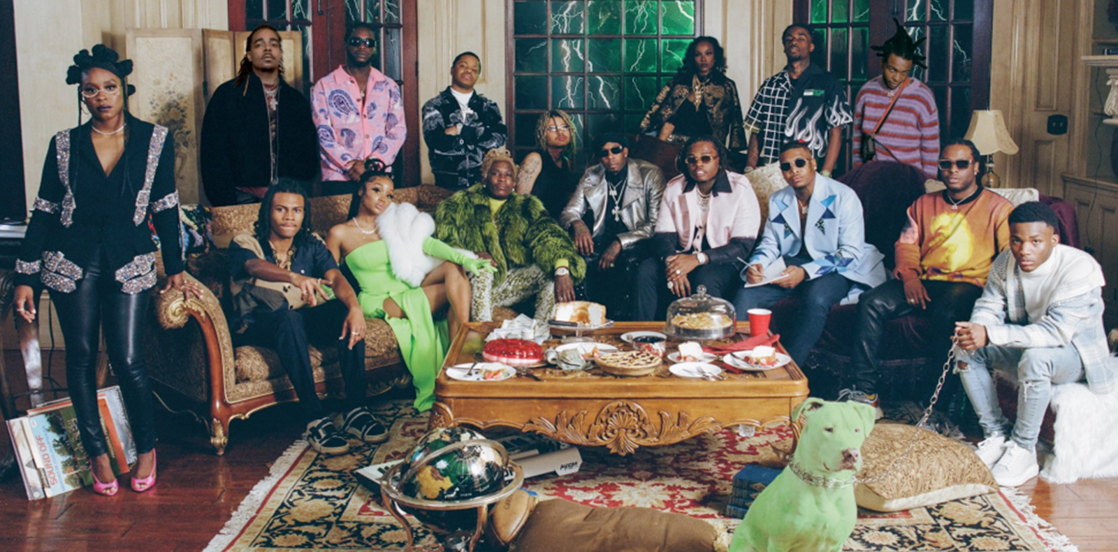 Elle devant : combinaison en viscose et Lurex imprimés, sac et escarpins, GUCCI. Elle derrière : veste sans manches en gabardine, robe en soie imprimée et escarpins, GUCCI. Lui derrière : bandeau, GUCCI. Baskets, REEBOK. Lui devant : tee-shirt en coton imprimé, pantalon en vinyle et bretelles, GUCCI. Baskets, REEBOK.