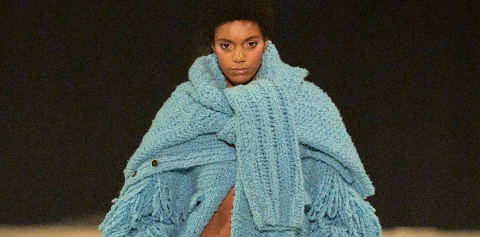 À une collection printemps-été 2021 futuriste et technique, portée par des pièces aux matériaux ergonomiques et innovants, succède un cru automne-hiver 2021-2022 tout en sensualité et en séduction. Si l’on y retrouve les coupes franches et minimalistes qui font le succès du label, s’invitent également des décolletés Bardot qui dévoilent franchement les épaules, des drapés qui enveloppent la silhouette, des robes et hauts raccourcis qui dévoilent les jambes, des franges qui vibrent, des découpes qui montrent la peau, de la fausse fourrure, des paillettes glamour et, pour finir, une robe en tissu transparent dont le motif tacheté évoque les lampes à UV des boîtes de nuit. Le tout s’accompagne de cuissardes noires, blanches ou intégralement recouvertes de strass, de chaussons sportswear et d’escarpins déclinés en noir, blanc, rouge, jaune ou vert fluo.