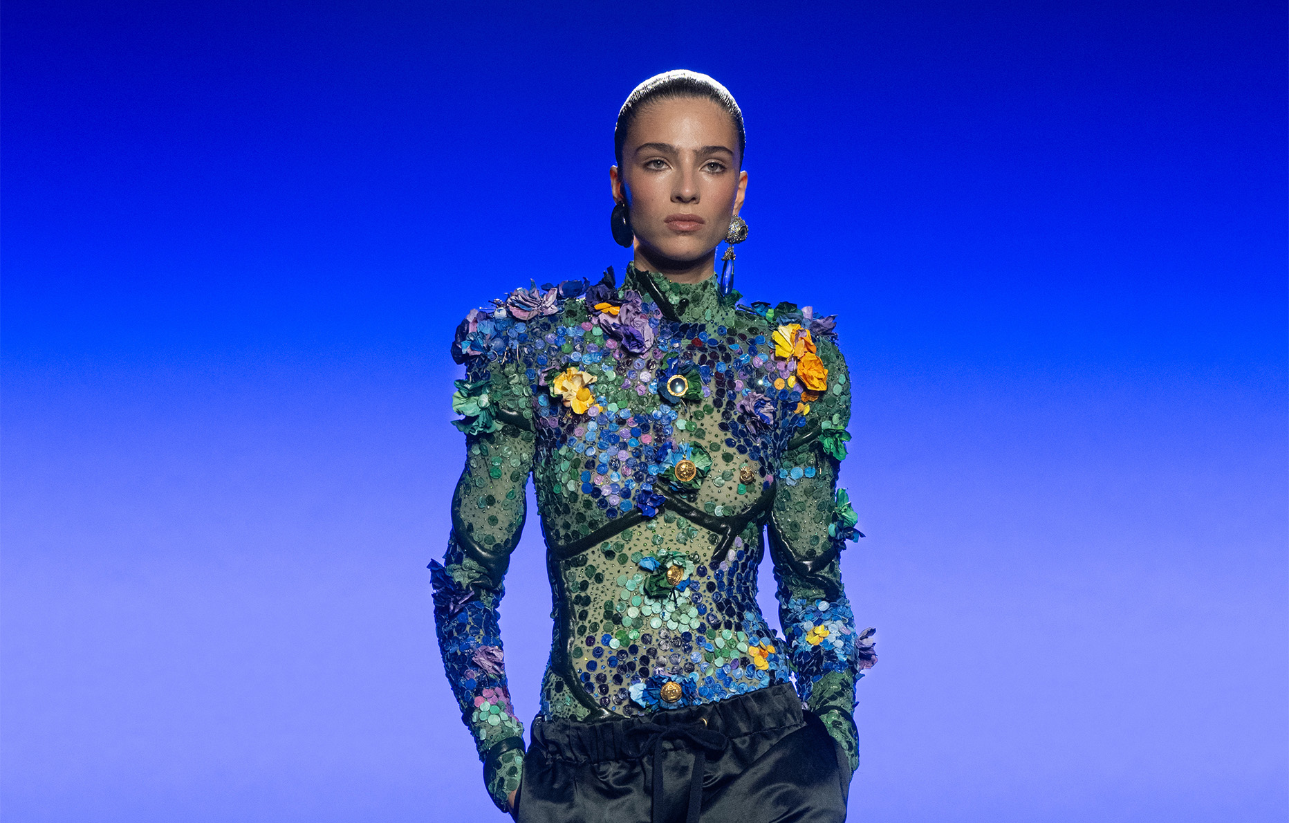 Enfin, sur les derniers looks présentés lors du final, l’un d’eux attire particulièrement notre attention. Portée par la top model Loli Bahia, figure phare de de la Fashion Week, la tenue se compose d’un top en tulle entièrement brodé de sequins peints à la main et de fleurs en papier. Dans des teintes de vert, de violet, de bleu et de jaune, cette création, comme ornée d’une myriade d’écailles de poisson, contraste avec un sarouel sombre assorti d’escarpins noirs à la signature Keyhole, emblème de Schiaparelli.