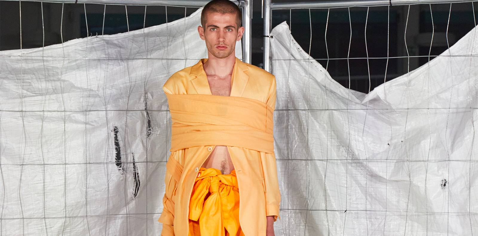 Imaginé comme un retour à l’essence du vêtement, le défilé prend place dans un hangar plongé dans le noir et au sol recouvert de sable, évoquant l’une des plages de la Riviera adriatique, fréquentée par le créateur durant sa jeunesse.
