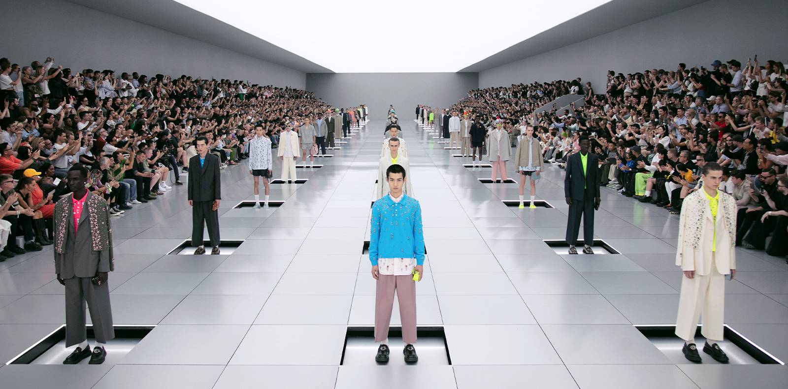 Pour ce faire, pas de podium inspiré du jardin champêtre de Christian Dior comme pour le défilé Dior printemps-été 2023 ou de pyramide de Gizeh en toile de fond pour le défilé Dior pre-fall 2023, mais bien une scénographie aseptisée, éclairée par une lumière blanche tamisée.
