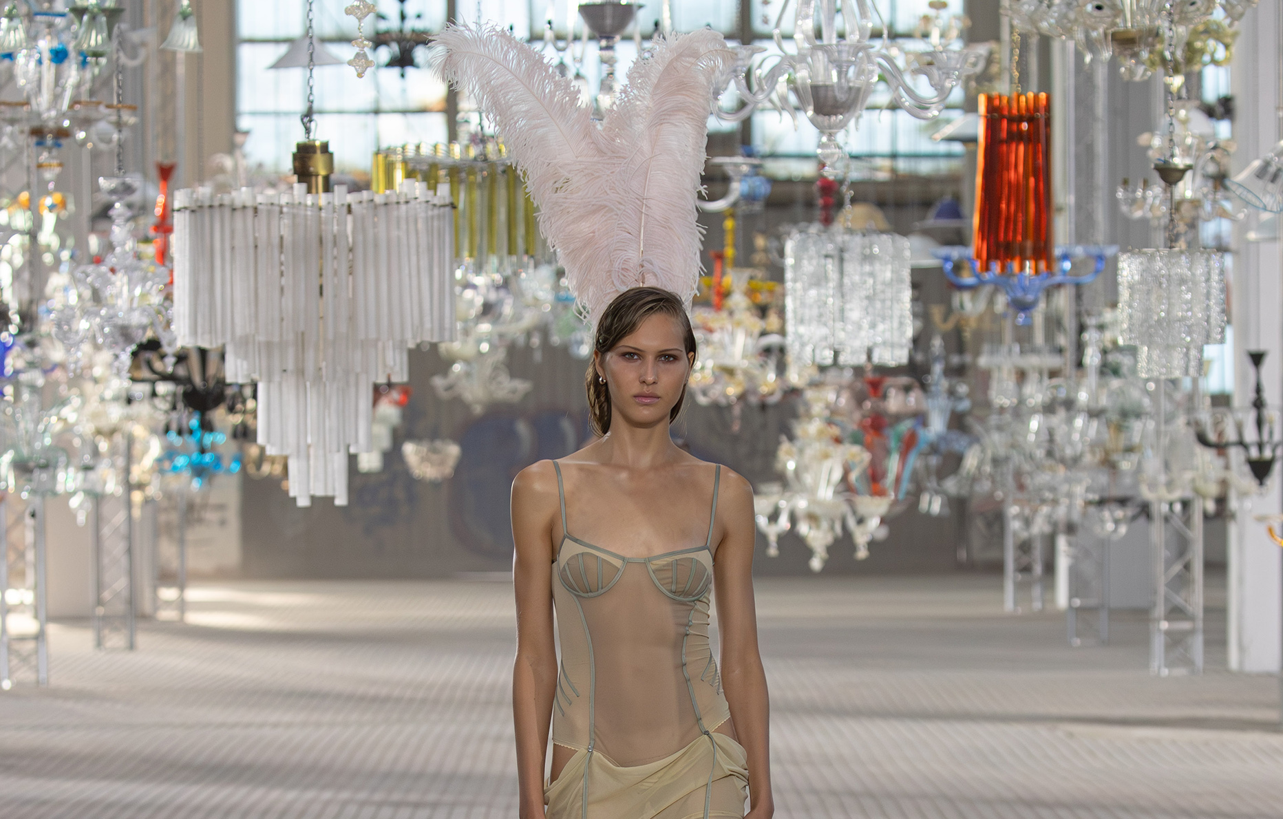 Ouvert et clôturé par la mannequin Vittoria Ceretti, le show, placé sous la direction du duo de créatrices italiennes Gilda Ambrosio et Giorgia Tordini, prend place dans un vaste hangar industriel empli de lustres suspendus.